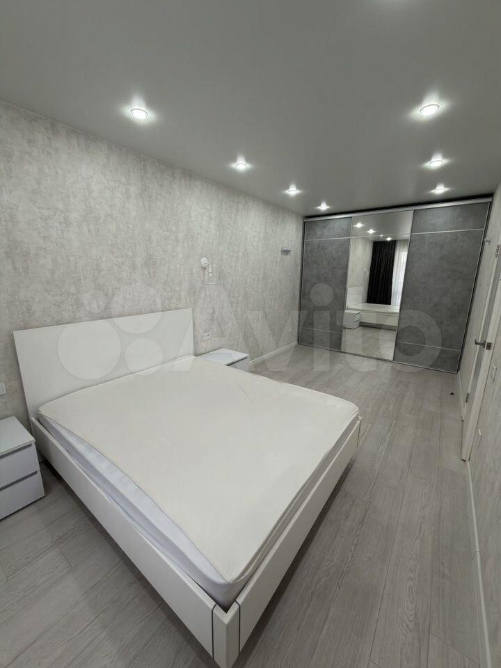 - В спальне: двухспальная кровать, шкаф-купе, зеркало, 2 прикроватные тумбочки, настенный телевизор.