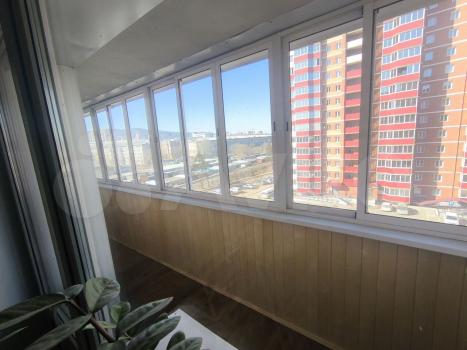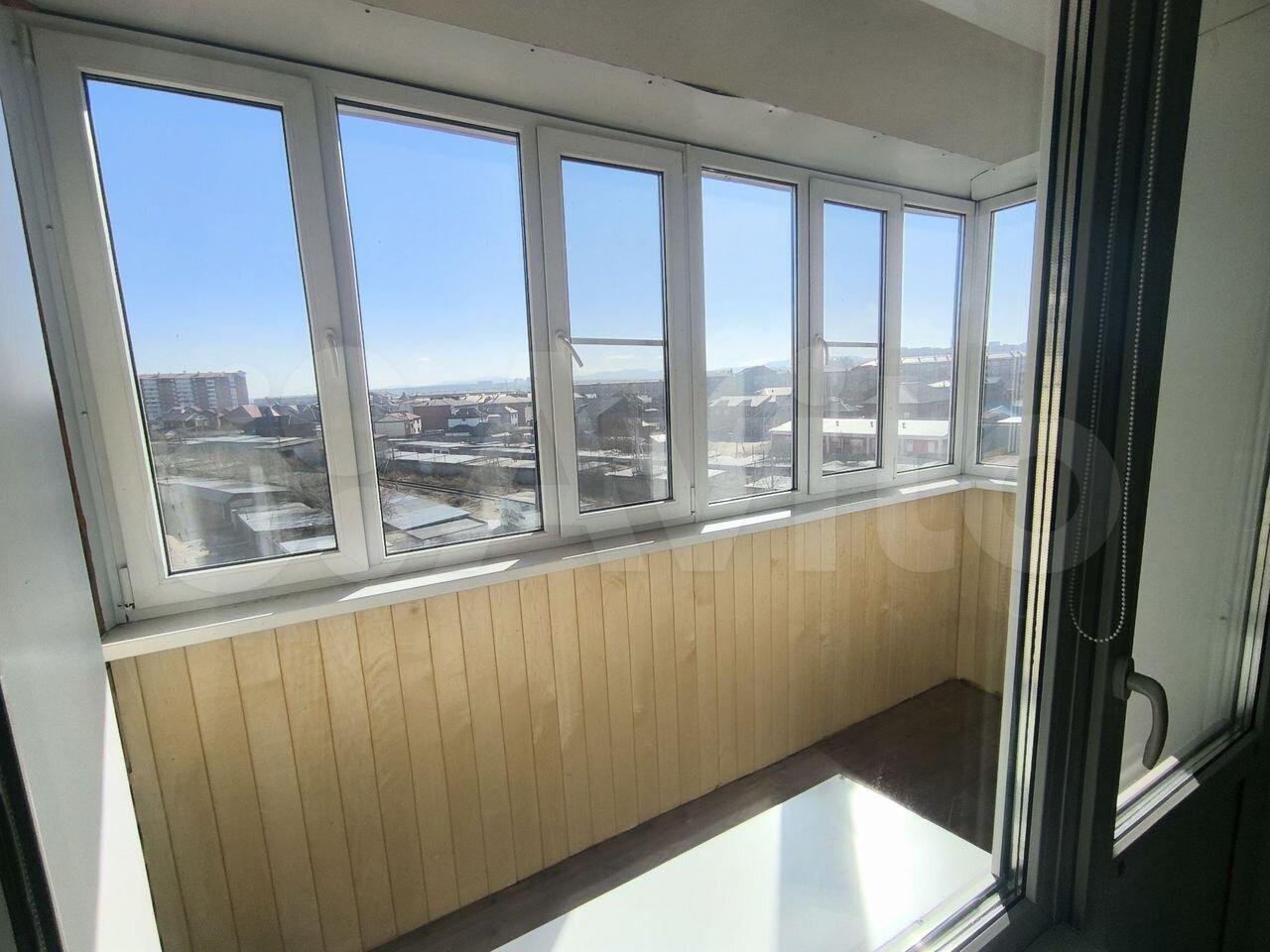 Балкон застеклен, с видом на городскую панораму. Парковка открытая во дворе.
