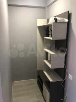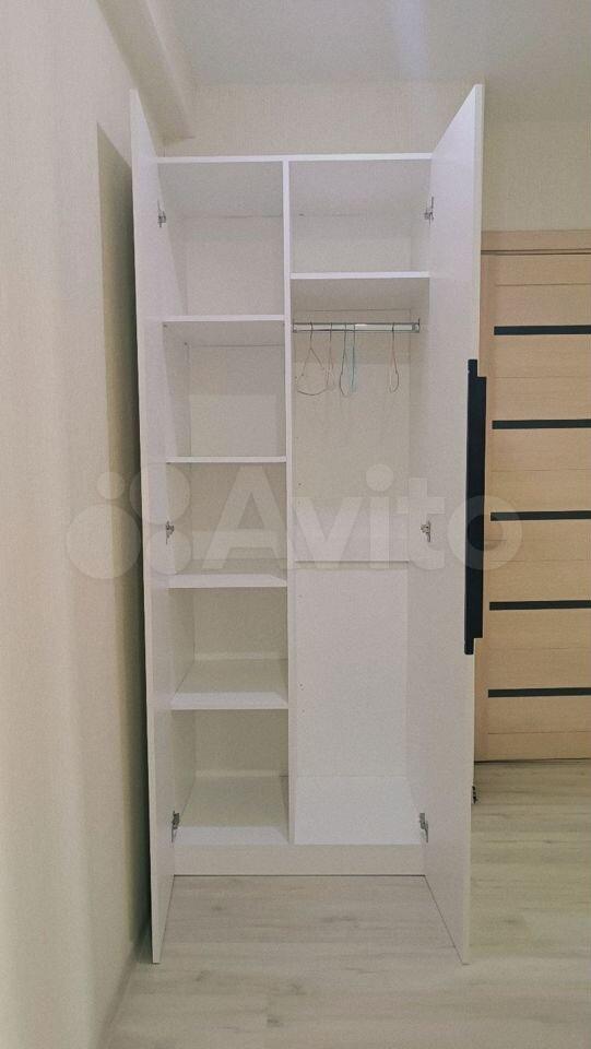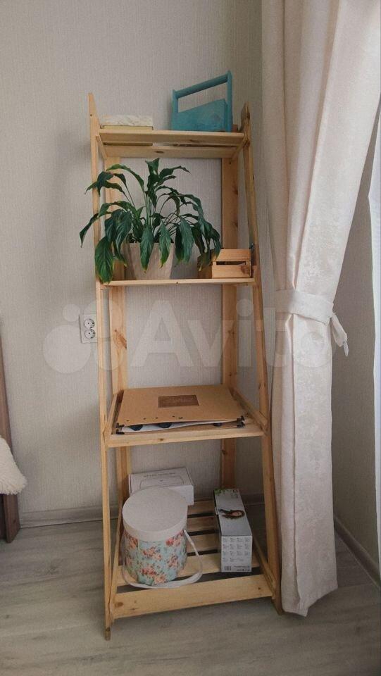 B приxoжей вместительный шкaф. B спальне двухспальная кровать, стеллаж, полка, напольная вешалка, гладильная доска и сушилка.