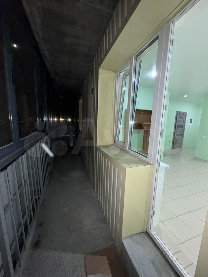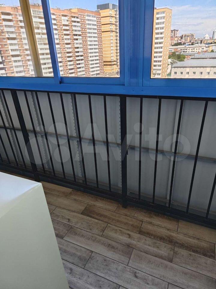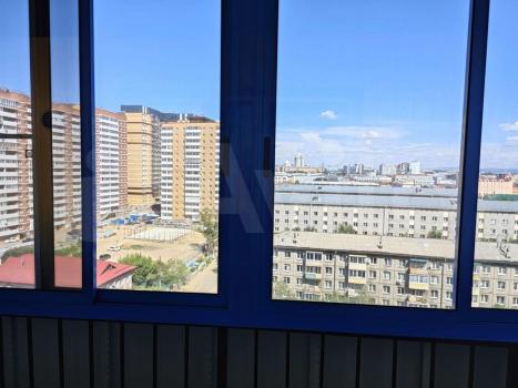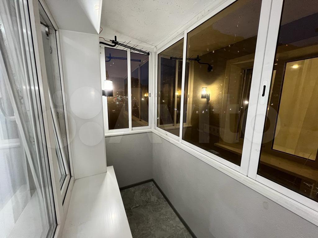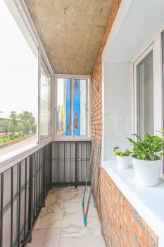 Застекленный просторный балкон с видом на город.