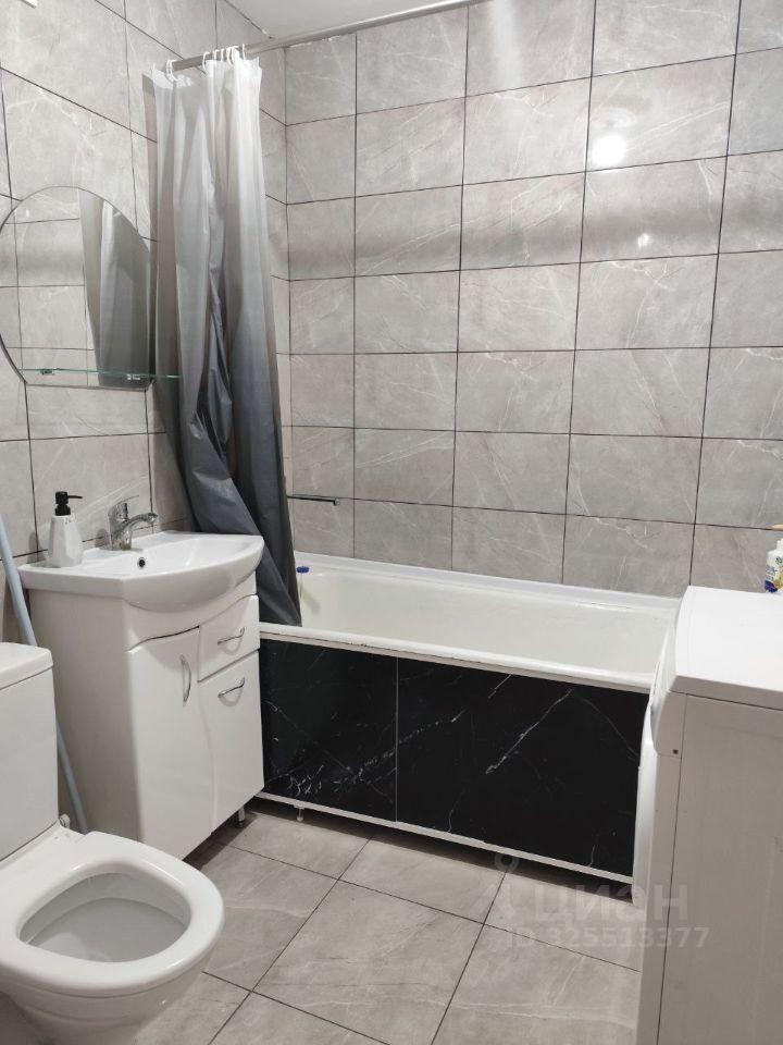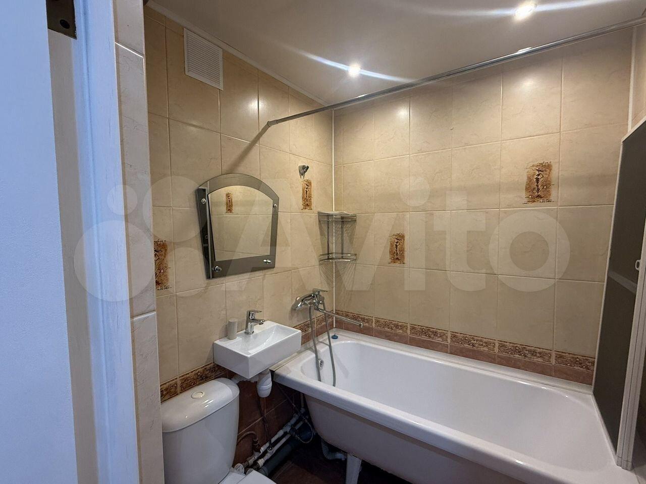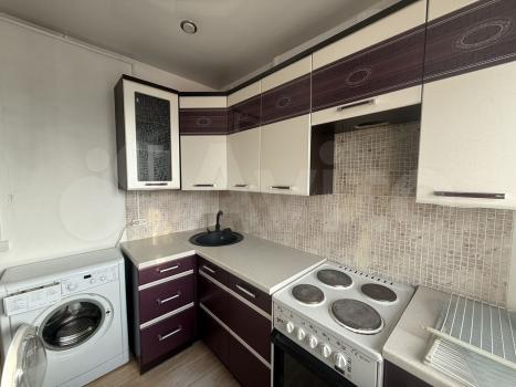 Кухня площадью 5 м² оборудована необходимой техникой: холодильником, плитой и стиральной машиной. Ванная комната совмещенная, оформлена плиткой, оснащена ванной и раковиной.