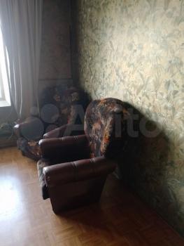 Из мебели: большой диван (раскладывается), гардероб большой на входе, гардеробный шкаф в коридоре, еще один шкаф. Пуф на входе, Кухня, кухонный стол , 2 пуфа, 1 табурет, большая двуспальная кровать, комод.